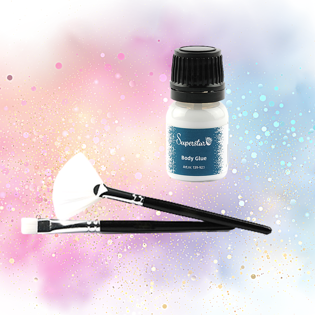 Le Superstar 2 Brush Set est un ensemble de base pour appliquer un tatouage à paillettes. Utilisez le pinceau plat pour appliquer les paillettes sur la Superstar Body Glue déjà transparente . Avec le pinceau éventail, vous enlevez l'excès de paillettes de la peau.