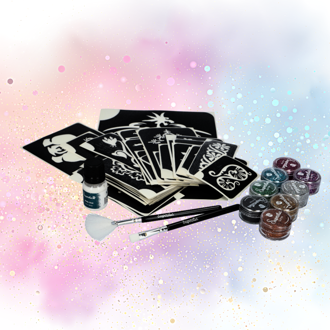 Contenu : 1 x 9 ml de colle corporelle Superstar (pour environ 65 tatouages), 8 couleurs de paillettes de la collection Superstar Fine Glitter de 5 ml, 50 pochoirs Glitter Tattoo, un ensemble de pinceaux et une carte d'instructions claire.