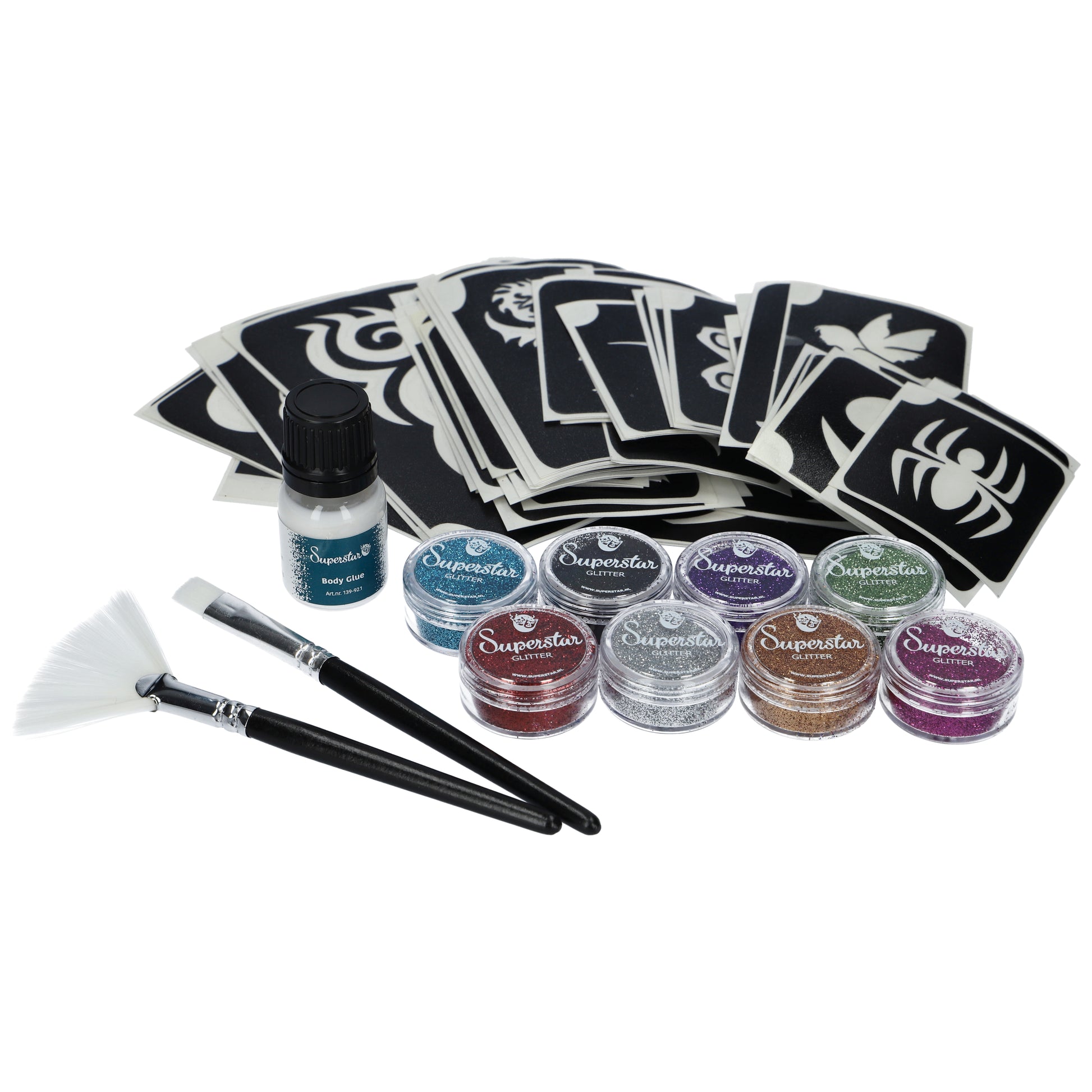 Contenu : 1 x 9 ml Superstar Body Glue (pour environ 65 tatouages), 8 couleurs de paillettes de la collection Superstar Fine Glitter de 5 ml, 50 pochoirs Glitter Tattoo, un jeu de pinceaux et une carte d'instructions claire.