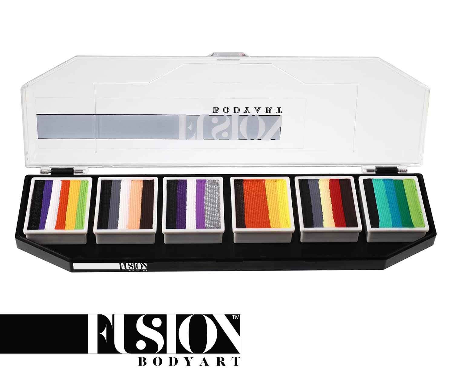 Les fards bicolores Fusion Body Art s’activent simplement avec de l’eau et s’utilisent à l’aide d’un pinceau plat ou d’une éponge.
