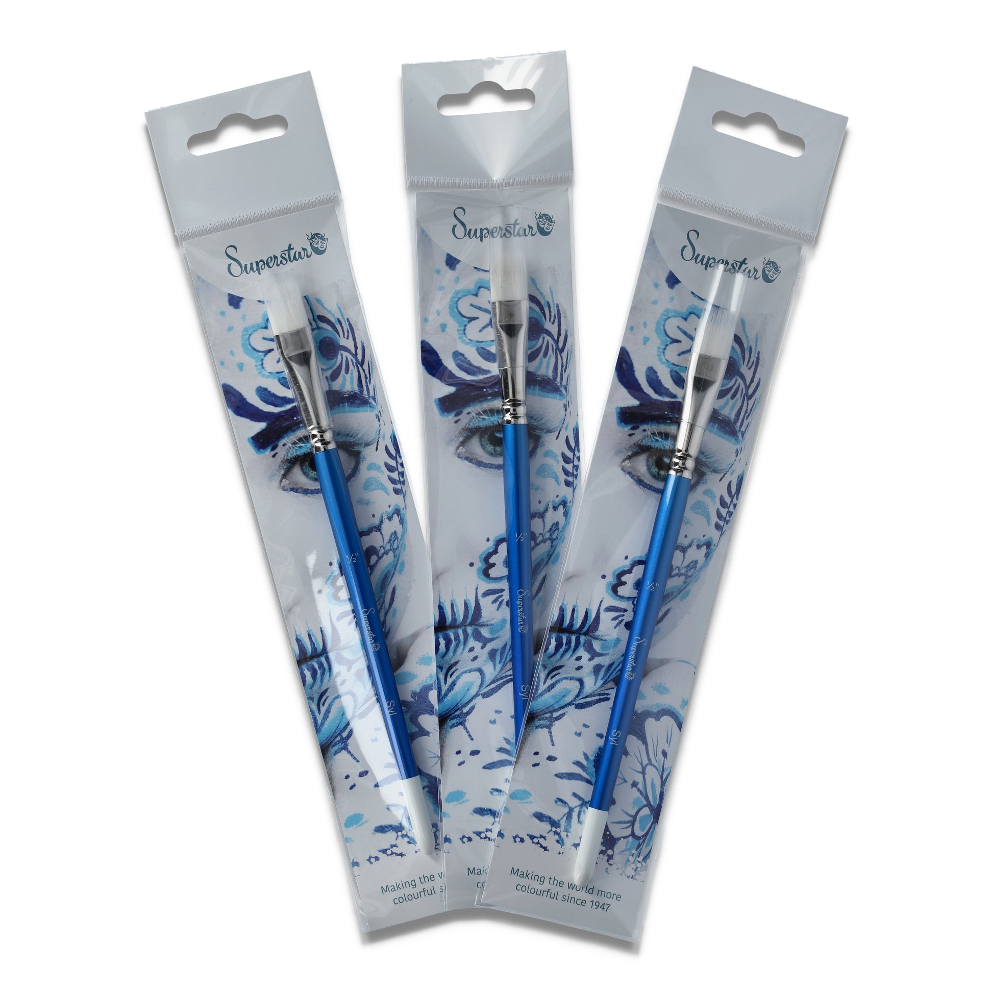 Le pinceau plat Superstar Wisp est un pinceau fait main de haute qualité. Le pinceau plat Superstar Wisp a la forme de base d'un pinceau plat, mais certains poils ont été coupés courts à intervalles réguliers, ce qui lui permet de tracer plusieurs lignes parallèles à la fois lorsque le pinceau chargé est traîné sur une surface. Les pinceaux Wisp peuvent ajouter des effets intéressants et délicats à un motif, comme de la fourrure, il vaut donc la peine d'essayer pour voir si c'est un bon choix pour vous. Le pinceau Superstar Wisp conserve sa forme, les poils sont solides, flexibles et ils font glisser la peinture sur la peau. Nettoyer avec le savon pour pinceaux Superstar.